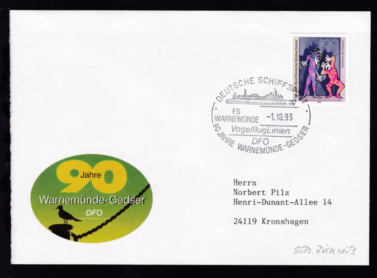 DEUTSCHE SCHIFFSPOST FS WARNEMÜNDE Vogelfluglinien DFO 90 JAHRE WARNEMÜNDE-