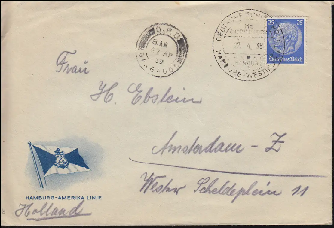 DEUTSCHE SCHIFFSPOST HAPAG HAMBURG-WESTINDIEN 22.4.1938 nach Amsterdam