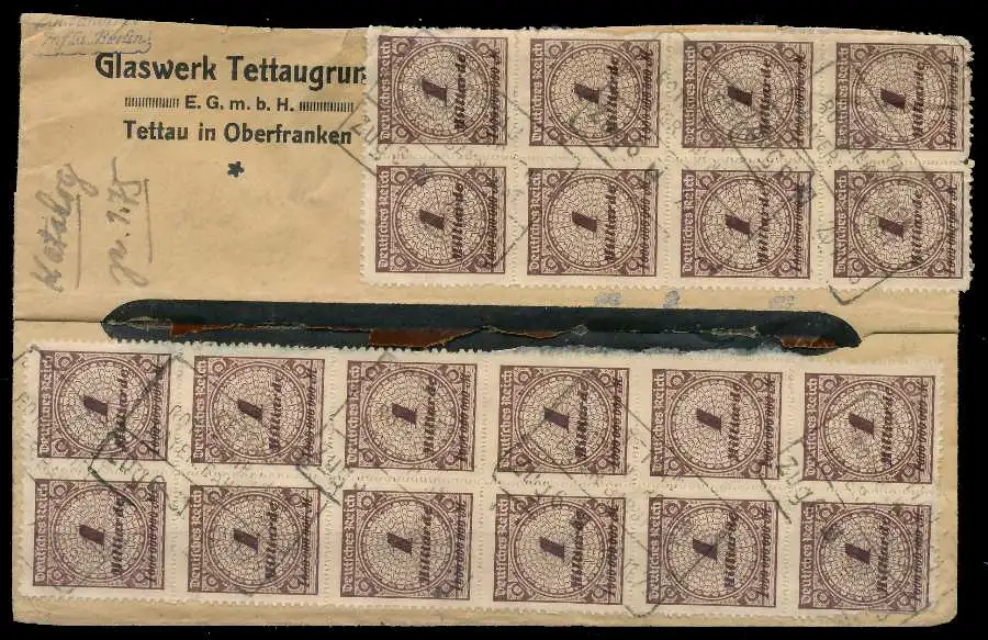 1 Mrd Mark Wert aus der Inflationsausgabe Kreis mit Rosetten- (Korbdeckel) Muster, durchstochen, 20 Marken mit Bahnpoststempel TETTAU auf Fensterkuvert, einige Marken beschädigt, nur 15 Marken bewertet