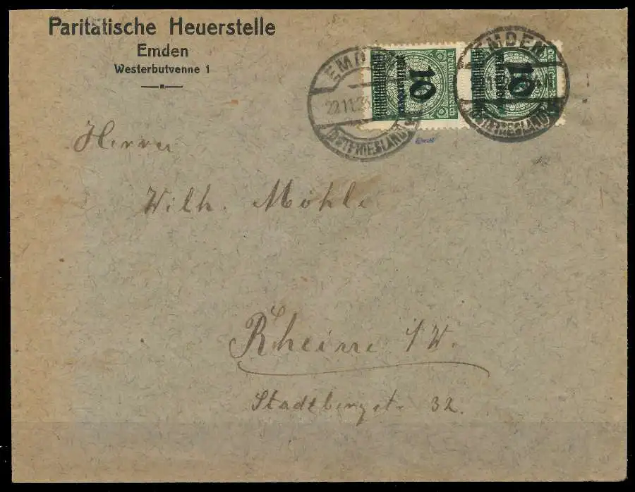 10 Mrd auf 50 Mio Mark Wert aus der Inflationsausgabe Kreis mit Rosetten- (Korbdeckel) Muster, mit Aufdruck der neuen Wertangabe, auf Fernbrief der 1. Gewichtsstufe von Emden nach Rheine