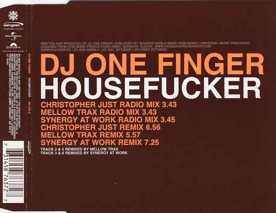 CD Single DJ One Finger - HouseF*cker, Zustand CD M- Hülle M-; 2001 Zeitgeist 587 637-2, Tracks Christopher Just Radio Mix, Mellow Trax Radio Mix, Synergy At Work Radio Mix, Christopher Just RMX, Mellow Trax RMX, Synergy At Work RMX