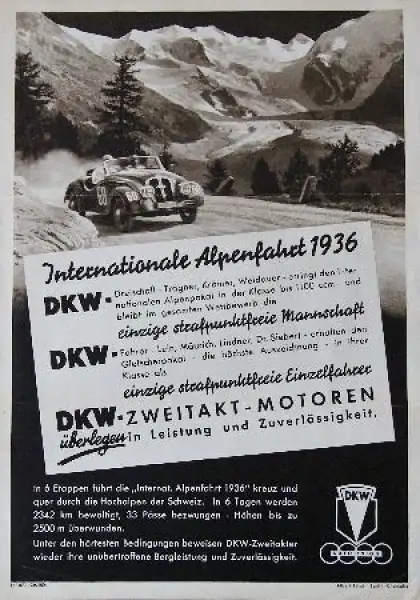 DKW Modellprogramm 1936 "Internationale Alpenfahrt" Automobilprospekt (8763)