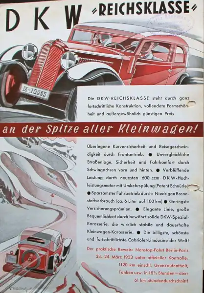 DKW Reichsklasse Modellprogramm 1933 Automobilprospekt (4634)