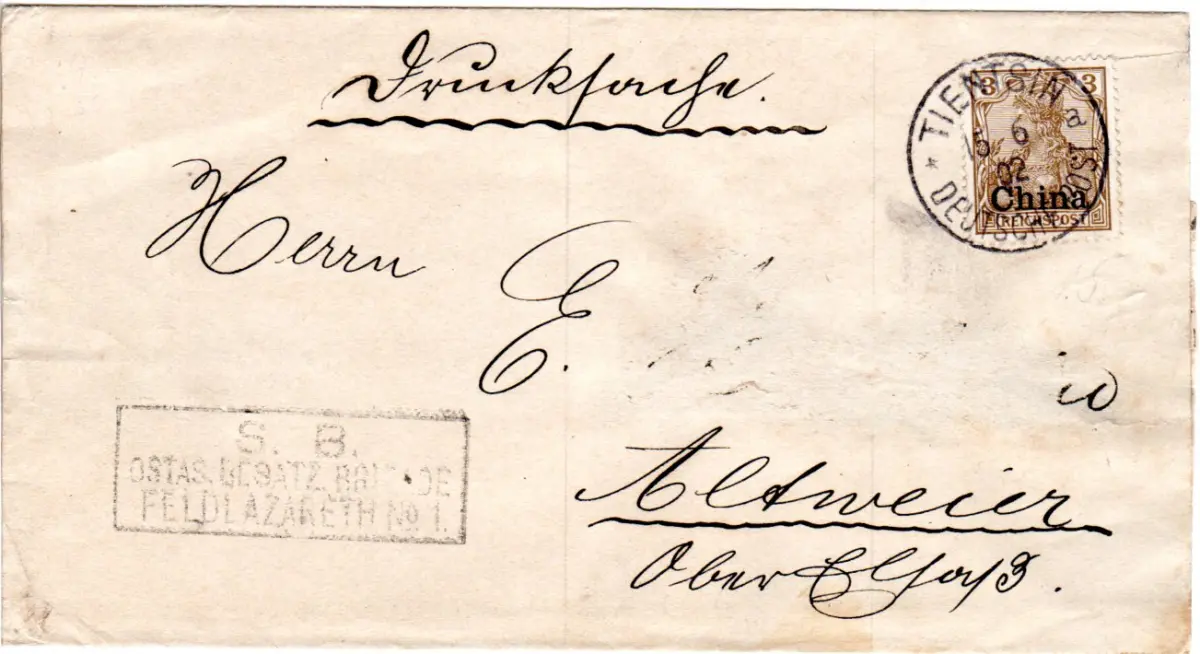 EF auf kpl. Drucksachenschleife (teil der Adresse radiert, siehe scan) m. klarem K1 Tientsin a DP u. Briefstempel S.B. Ostas. Besatz. Brigade Feldlazarth No.1