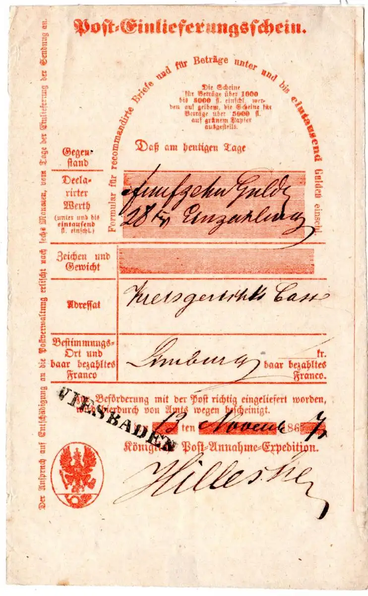 DR 1871, L1 Wiesbaden auf Postschein f. eine Wertsendung