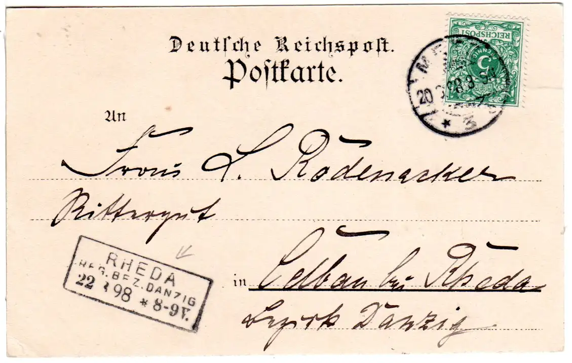 DR 1898, R3 RHEDA Reg. Bez. DANZIG als Ankunftstpl. auf Karte v. Metz m. 5 Pf.