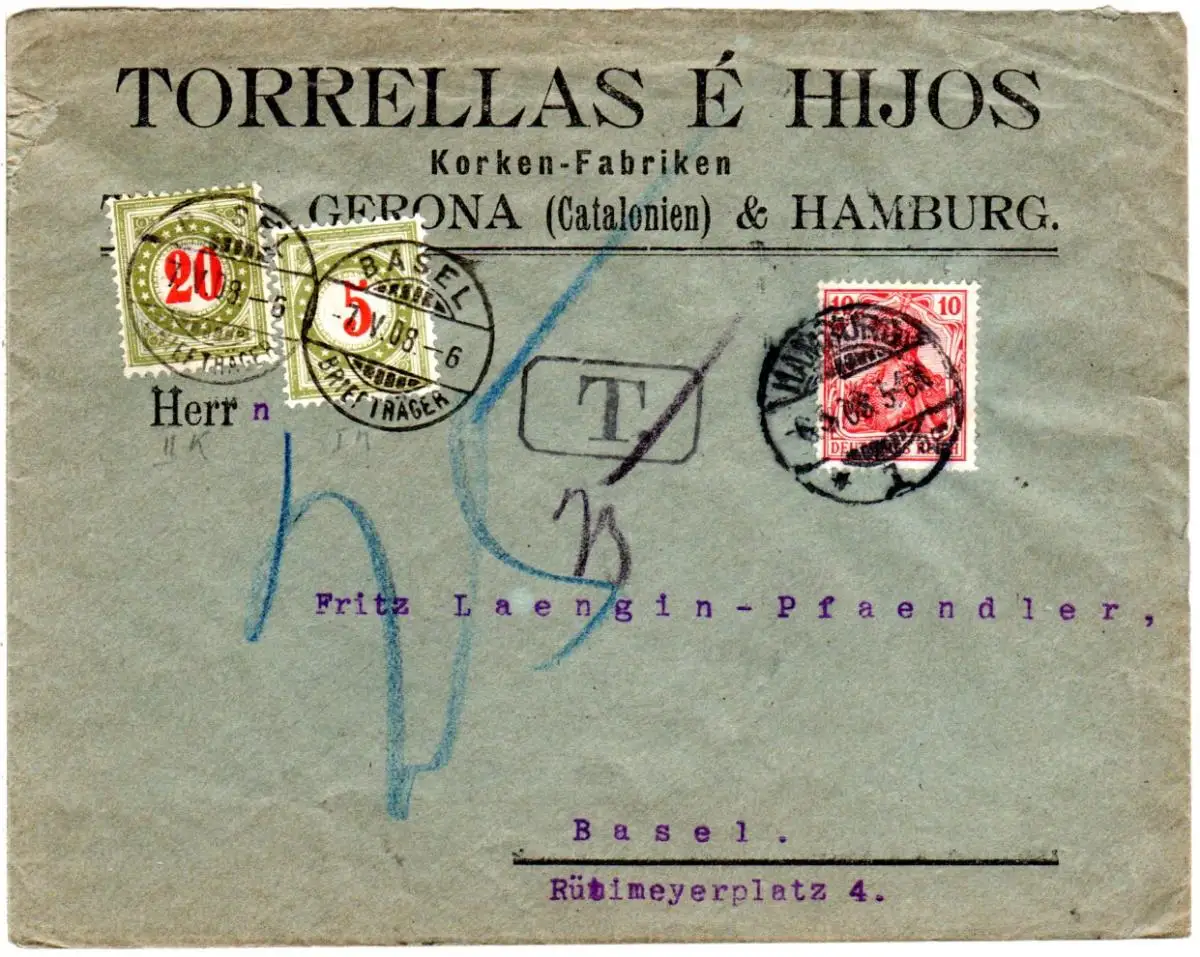 DR 1908, 10 Pf. Germania auf Firmen Bief v. Hamburg m. Schweiz 5+20 C. Porto