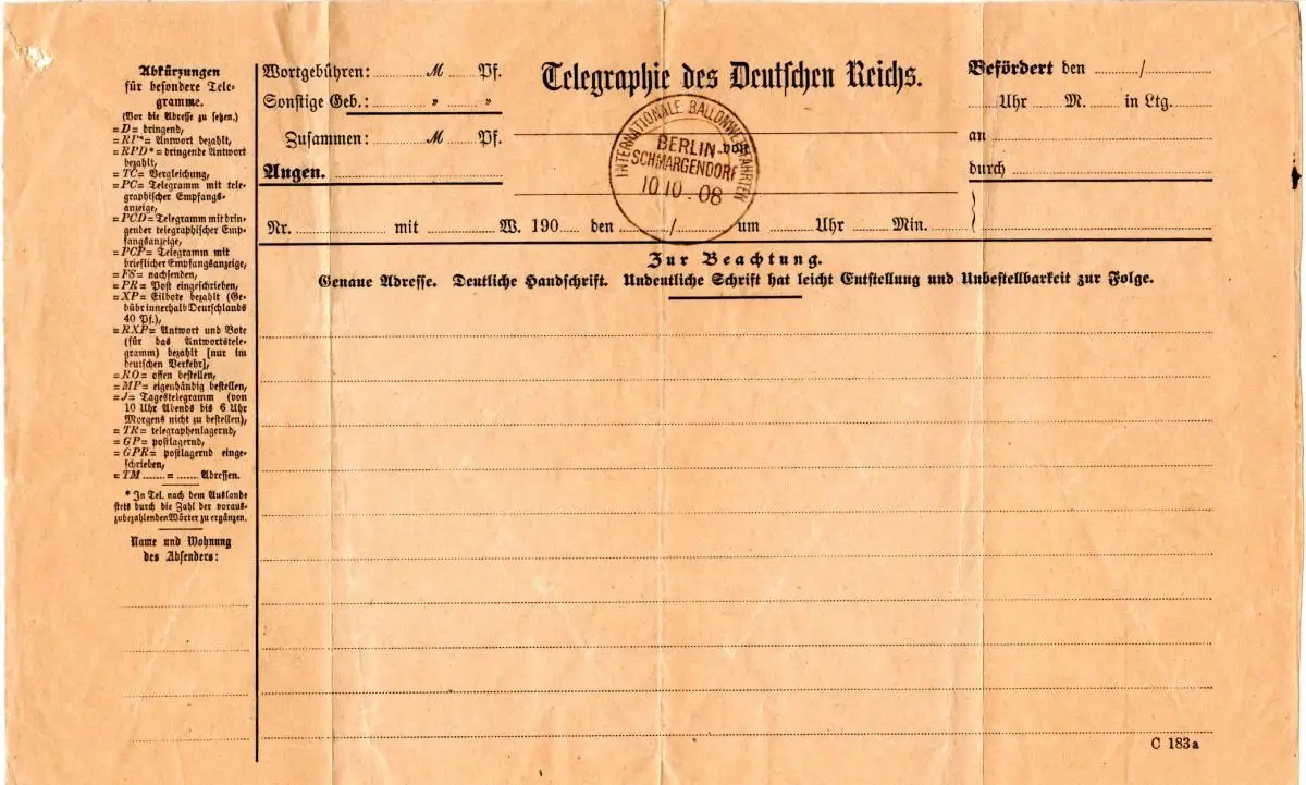 Erster amtlicher Sonderstempel einer Luftfahrtveranstaltung in Deutschland! (Michel 9, 150 €). Hier klar auf Telegrammformular. Interessant auch f. Aviatik-/Ballon-Sammler!