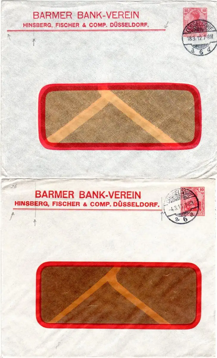 2 versch. Typen des 10 Pf. Germania Privatganzsachenumschlag Barmer Bank Verein, Hinsberg, Fischer & Comp., Düsseldorf. Absenderdruck hellrot u. dünn bzw. dunkelrot und dick. Untere Doppellinie bis knapp vor u. nach 2. Zeile bzw. weit darüber hinaus.
