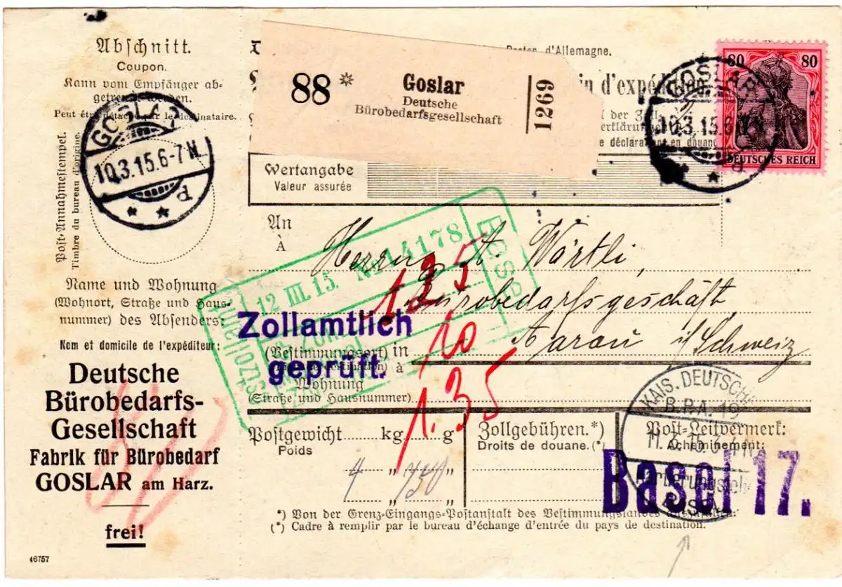 Paketaufkleber "Goslar Deutsche Bürobedarfsgesellschaft". Diverse Stpl., u.a. "Bahnpost B.P.A. 19 Kartierungsstelle Basel". Interessant auch für Thematik Motiv Büro!
