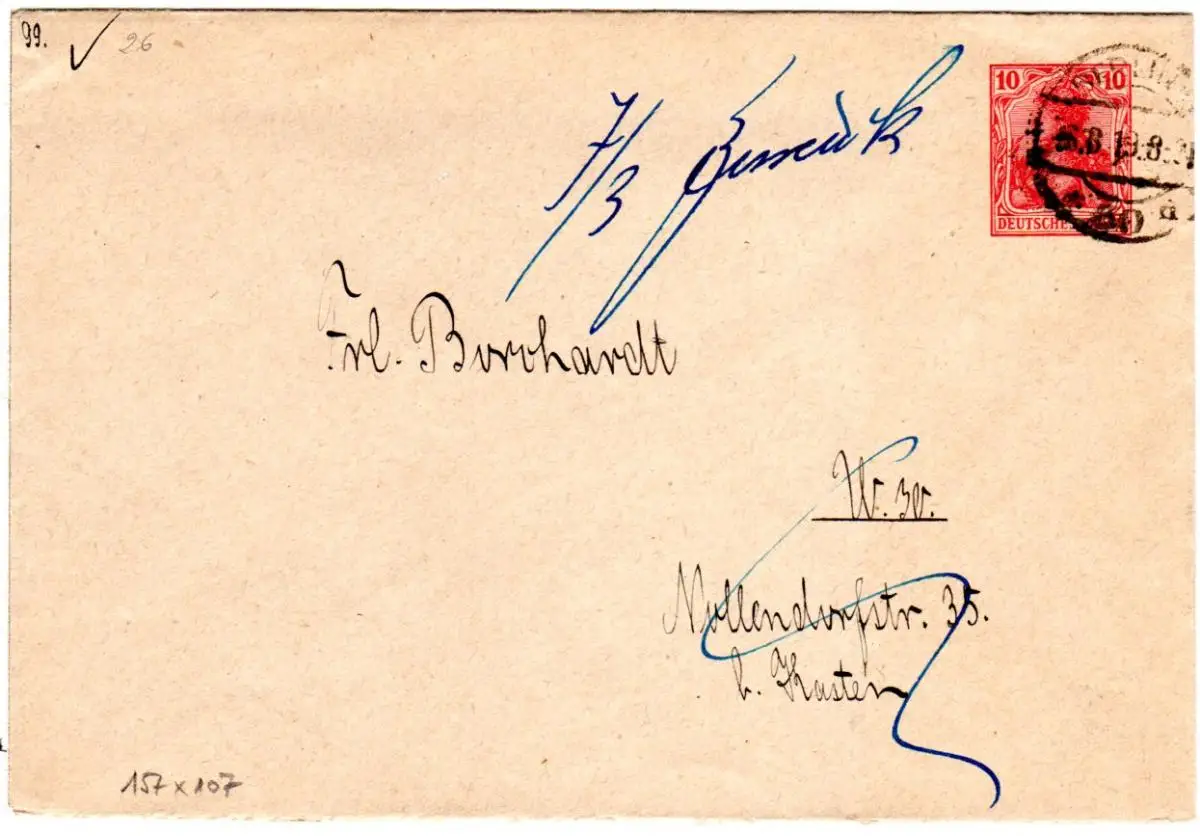 DR,1919 in Berlin gebr. 10 Pf. Germania Privatganzsachenumschlag m. zurück-Stpl.