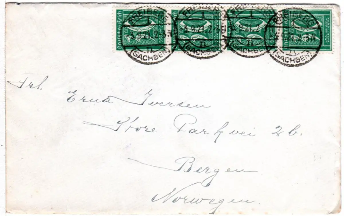 DR 1921, MeF 4er-Streifen 30 Pf. auf Brief v. Freiberg (Sachsen) n. Norwegen