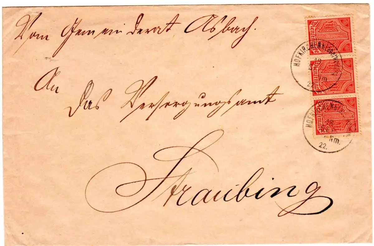 DR 1922, MeF 3er-Streifen 1 Mk. Dienst auf Asbach Gemeinde Brief ab Hofkirchen