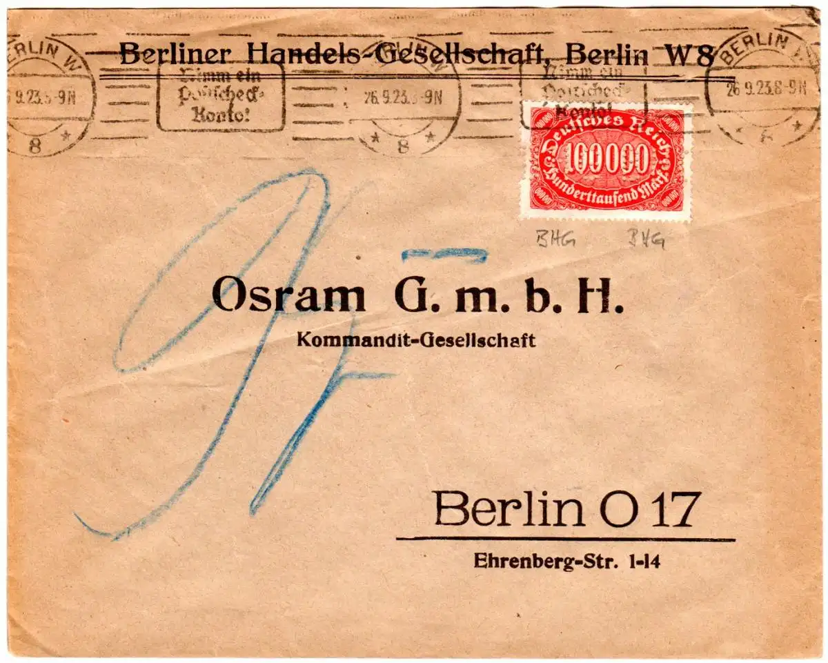 100000 Mk. m. Firmenlochung BHG auf Berliner Handelsgesellschaft Firmenbrief an die Osram GmbH.