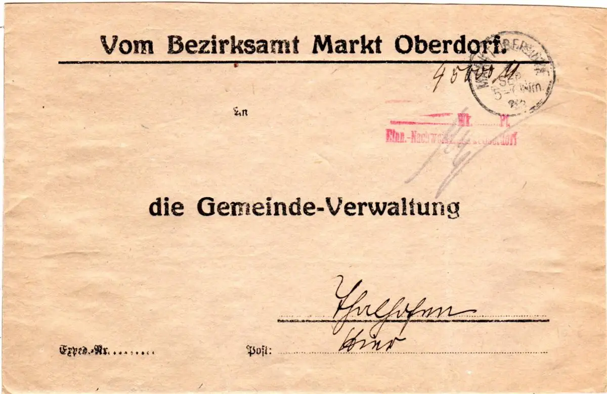 Roter Barfrankierungs-Stempel "45000" Mk. Einn.-Nachweis Markt Oberdorf auf Bezirksamt Vordruckumschlag