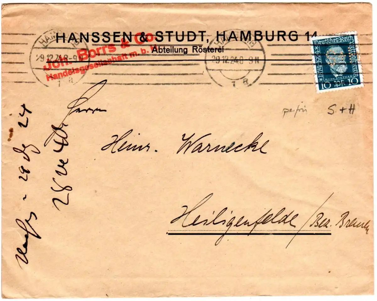 Firmenlochung S + H auf Hanssen & Studt, Abt. Rösterei (Kaffee Import/Export) Vordruckumschlag v. Hamburg n. Heligenfelde Bz. Bremen.