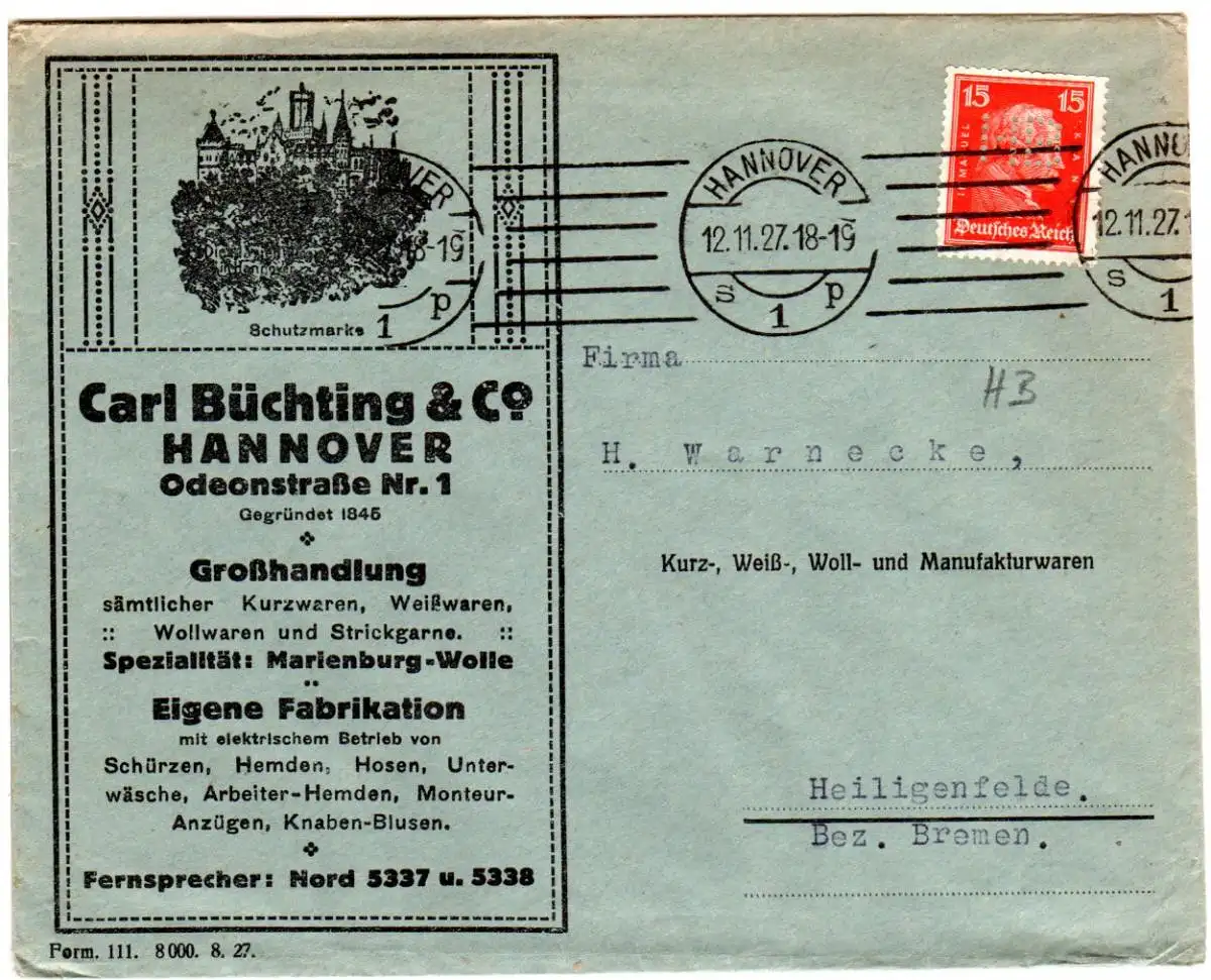 Firmenlochung HB auf illustriertem Carl Büchting & Co. Vordruckumschlag v. Hannover n. Heligenfelde Bz. Bremen.