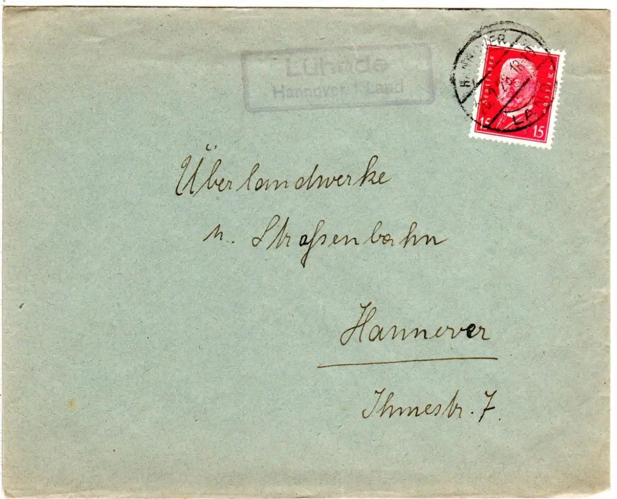 DR 1928, Landpost Stpl. LÜHNDE Hannover Land auf Brief m. 15 Pf.