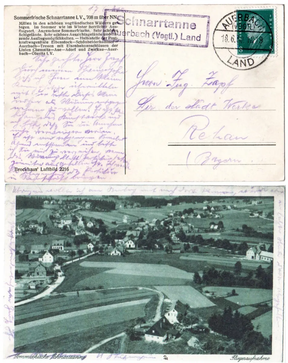 DR 1930, Landpost Stpl. SCHNARRTANNE Auerbach (Vogtl.) Land auf sw-AK m. 8 Pf.