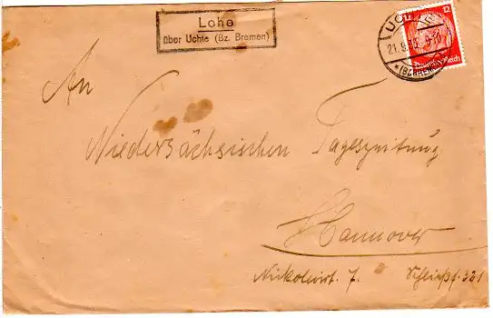 DR 1933, Landpost Stpl. LOHE über Uchte (Bz. Bremen) auf Brief m. 12 Pf.