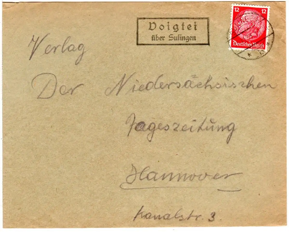 DR 1933, Landpost Stpl. VOIGTEI über Sulingen auf Brief m. 12 Pf.