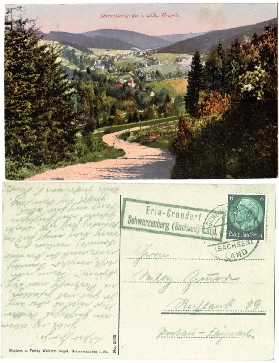 DR 1933, Landpoststpl. ERLA-CRANDORF Schwarzenberg Land auf Farb-AK m. 6 Pf.