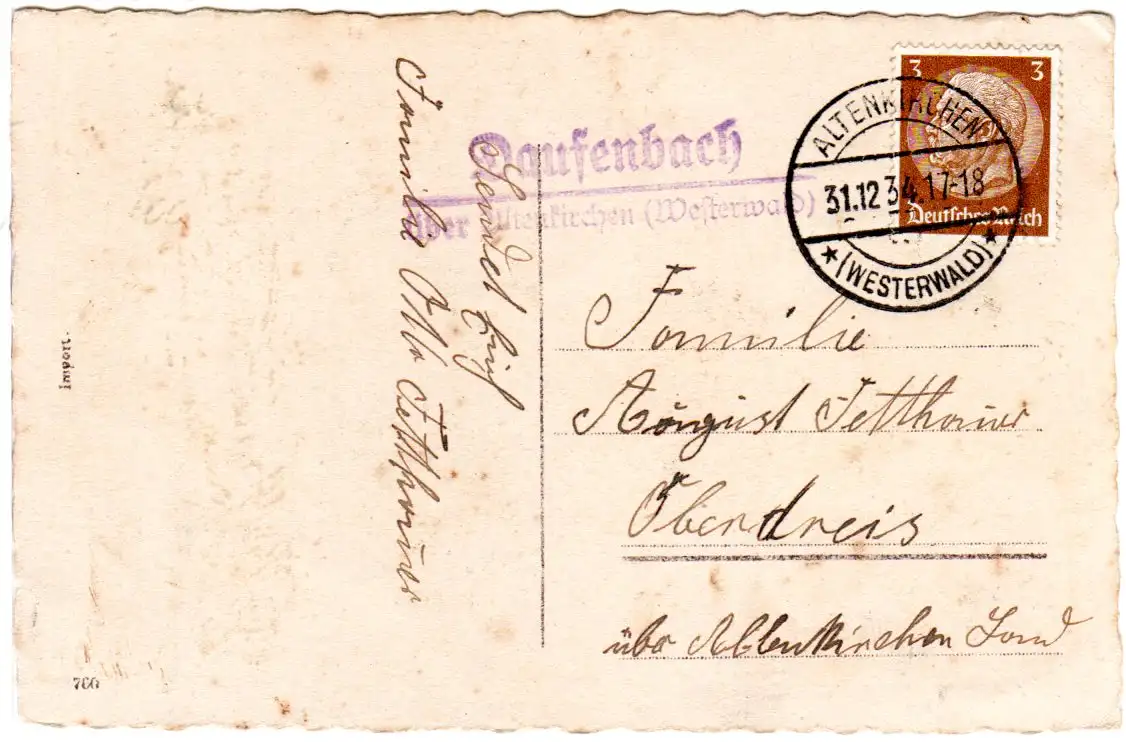 DR 1934, Landpost Stpl. DAUFENBACH über Altenkirchen auf Karte m. 3 Pf.