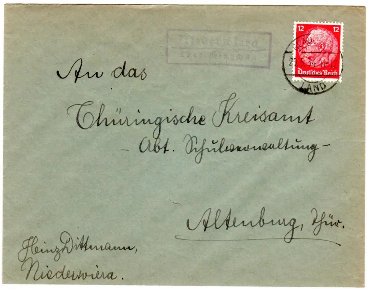 DR 1934, Landpost Stpl. NIEDERWIERA über Glauchau auf Brief m. 12 Pf.