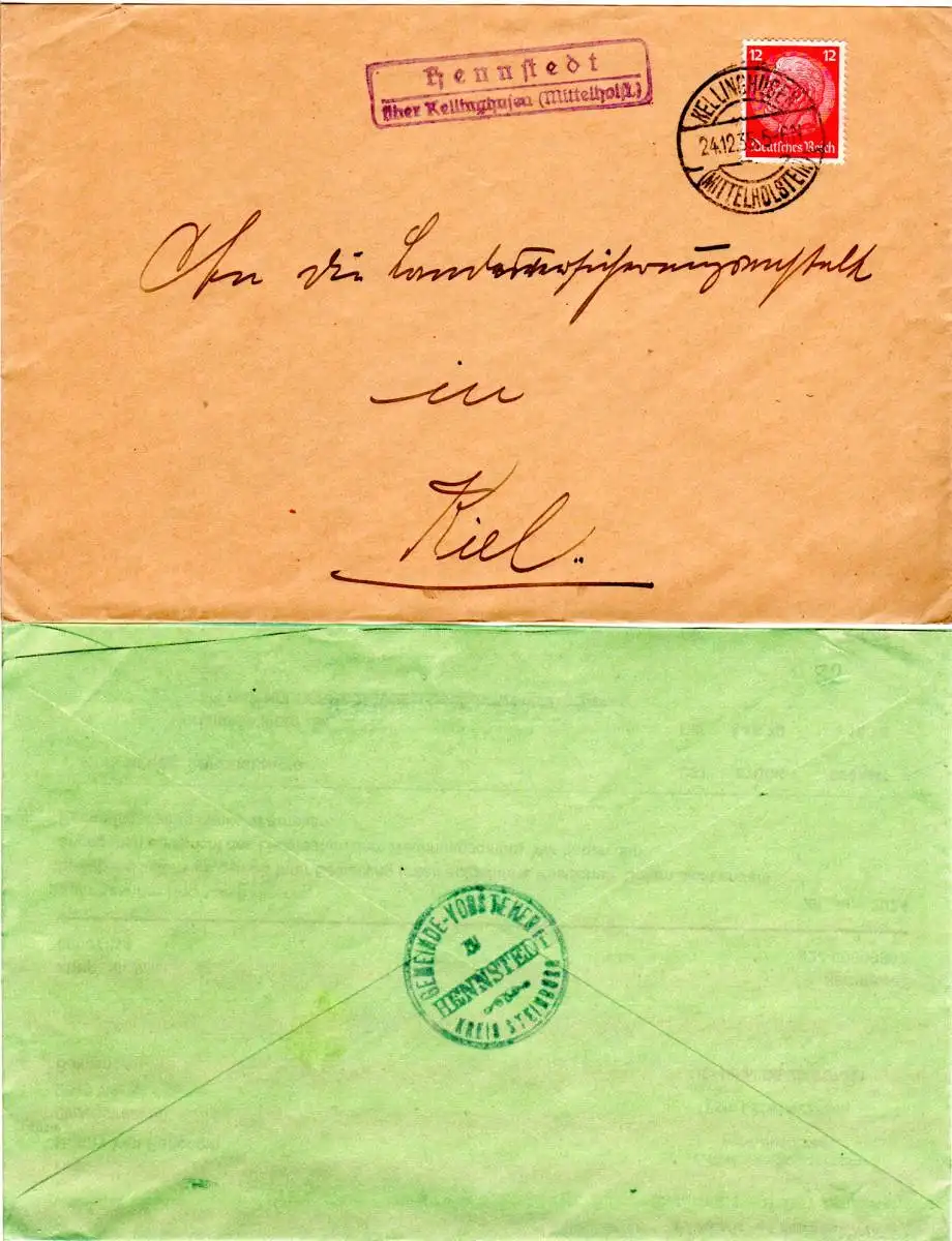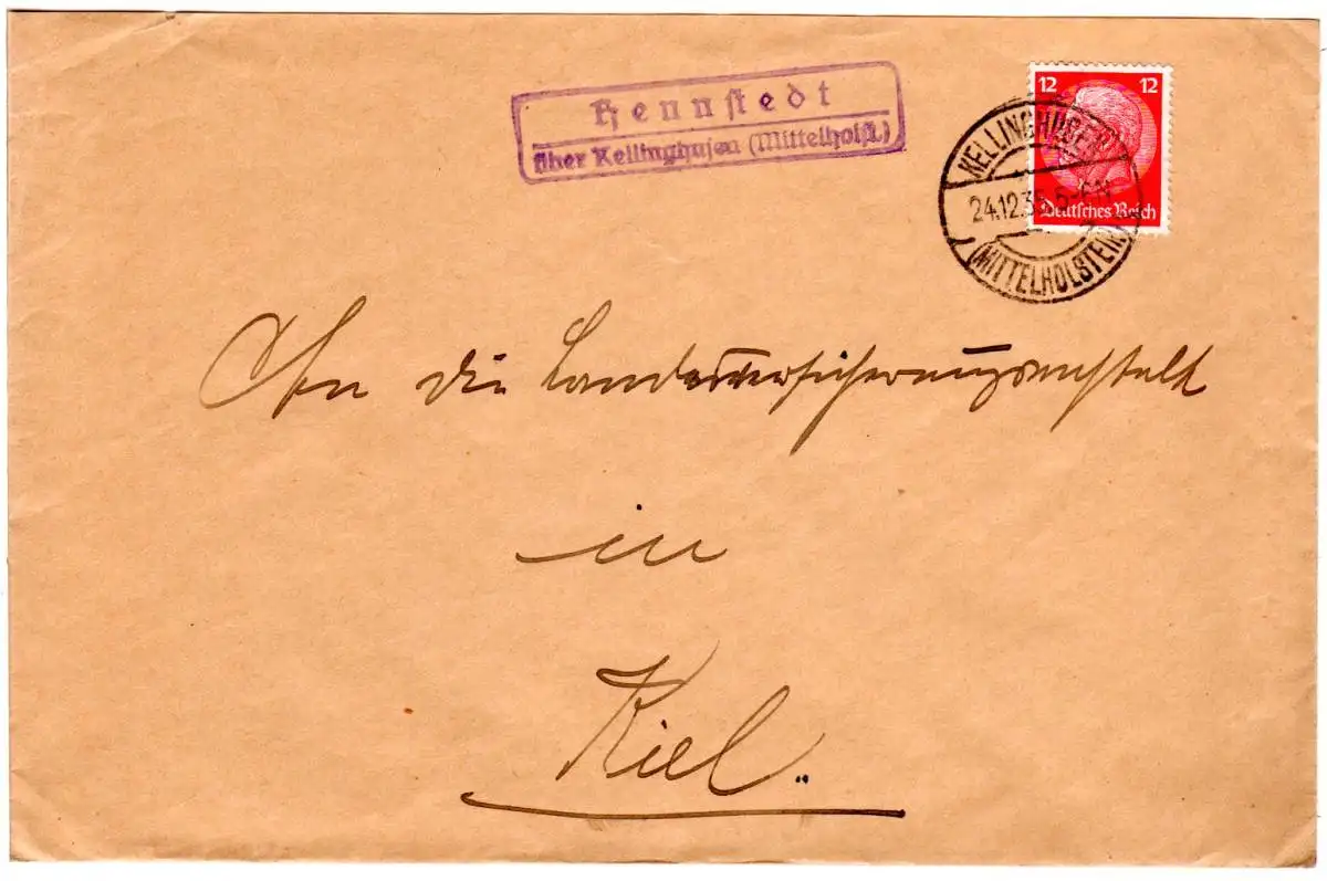 DR 1935, Landpost Stpl. HENNSTEDT über Kellinghusen auf Gemeide Brief m. 12 Pf.