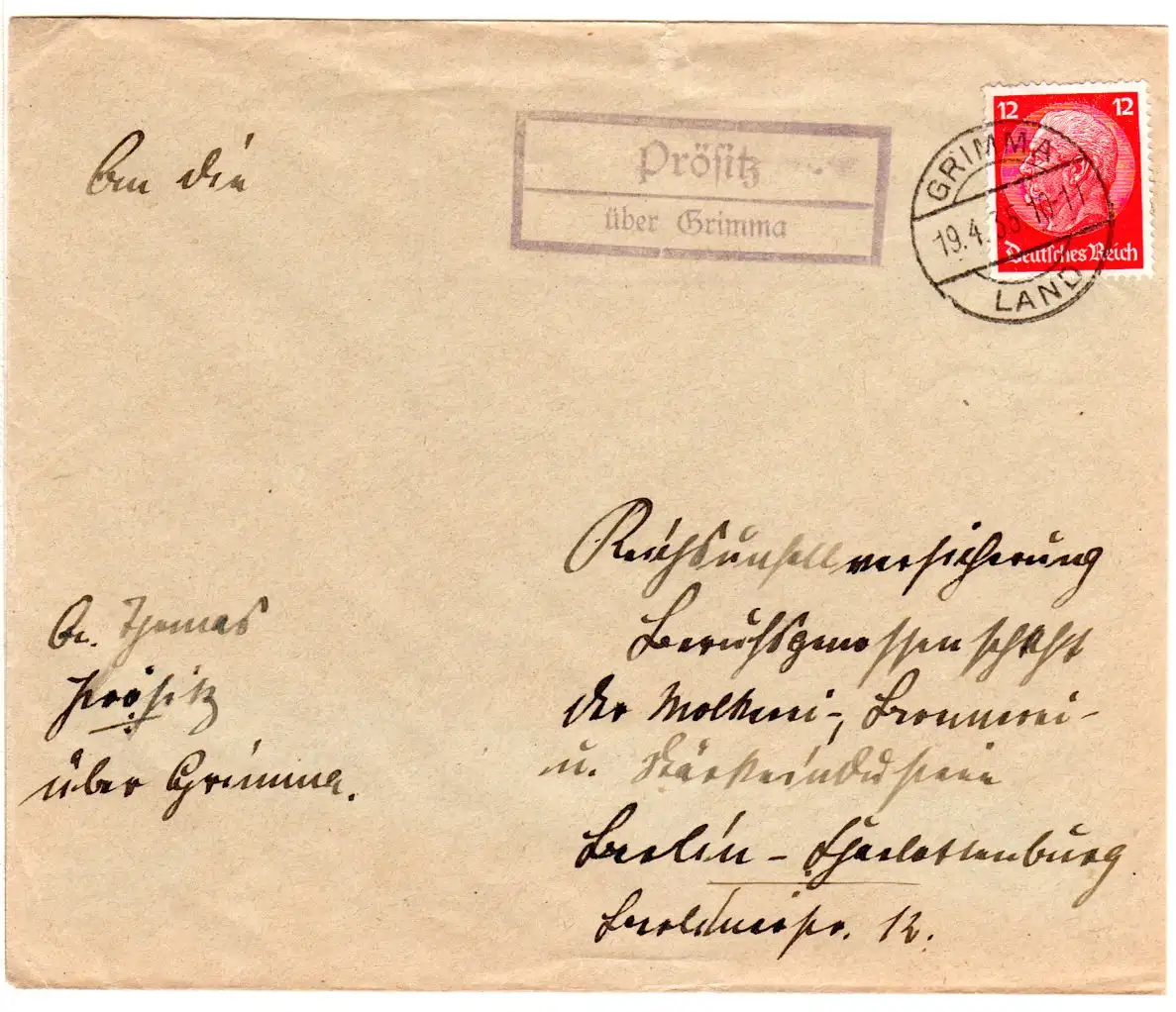 DR 1935, Landpost Stpl. PRÖSITZ über Grimma klar auf Brief m. 12 Pf.