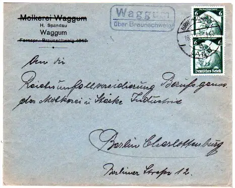 DR 1935, Landpost Stpl. WAGGUM über Braunschweig auf Molkerei Brief m. 2x6 Pf.