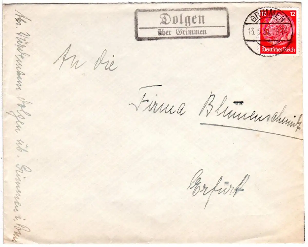 DR 1936, Landpost Stpl. DOLGEN über Grimmen auf Brief m. 12 Pf.