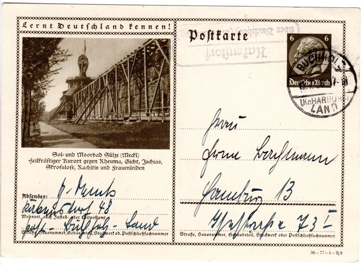 DR 1936, Landpost Stpl. KAKENSTORF über Buchholz auf 6 Pf. Bildganzsache Sülze.