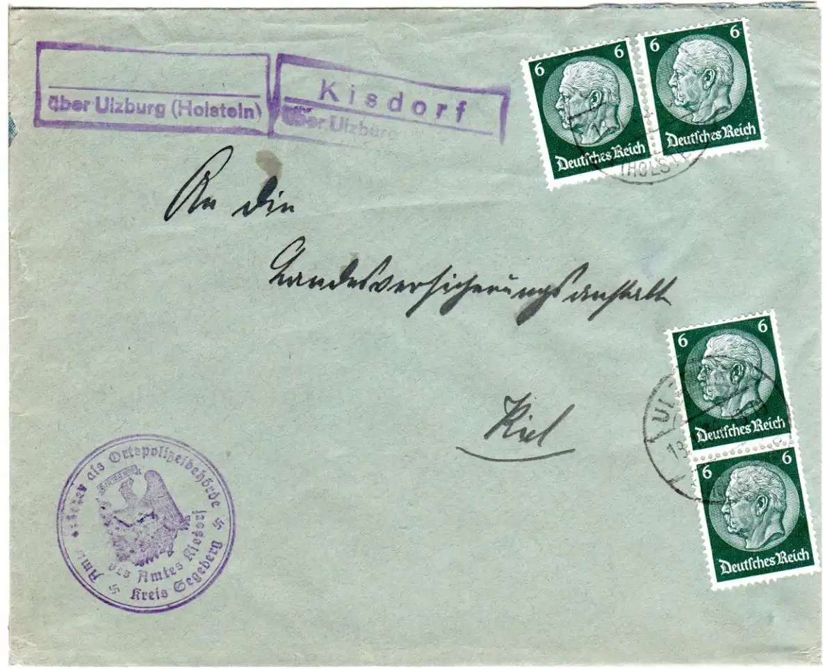 DR 1936, Landpost Stpl. KISDORF über Ulzburg (Holstein) auf Brief m. 4x6 Pf.