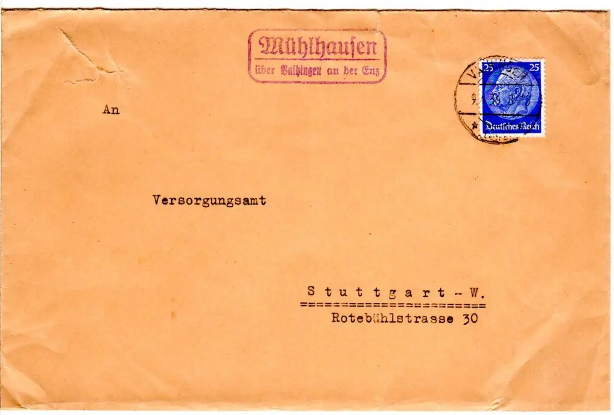 DR 1936, Landpost Stpl. MÜHLHAUSEN über Vaihingen an der Enz auf Brief m. 25 Pf.