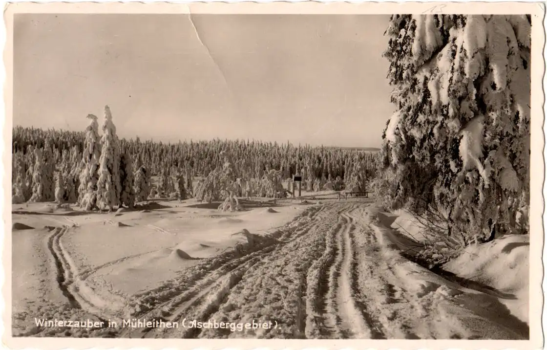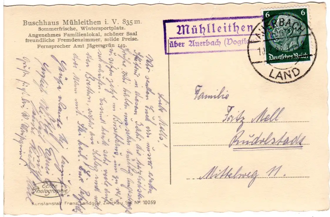 DR 1936, Landpost Stpl. MÜHLLEITHEN über Auerbach (Vogtland) auf sw-AK m. 6 Pf.