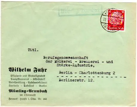DR 1936, Landpost Stpl. MÜMLING-GRUMBACH auf Firmen Brief m. Stpl. Höchst