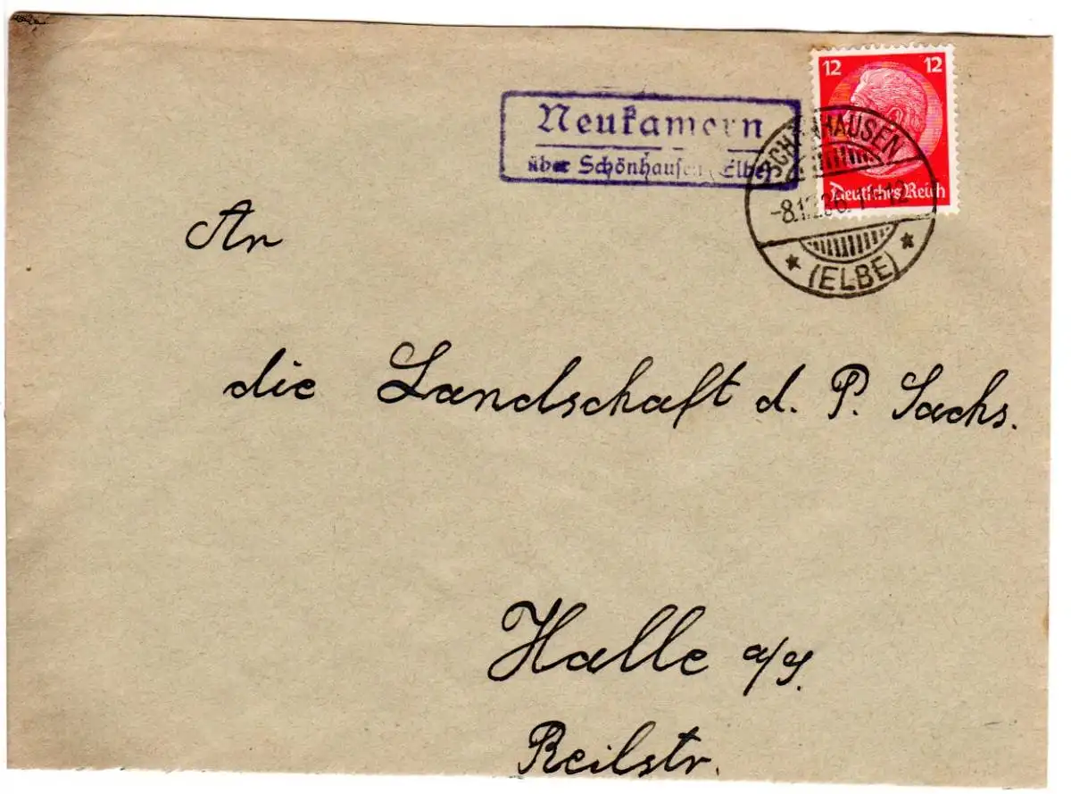 DR 1936, Landpost Stpl. NEUKAMERN über Schönhausen (Elbe) auf Brief m. 12 Pf.