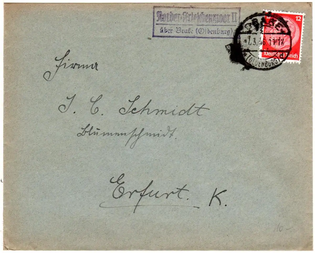 DR 1936, Landpost Stpl. NORDER-FRIESCHENMOOR II über Brake auf Brief m. 12 Pf.
