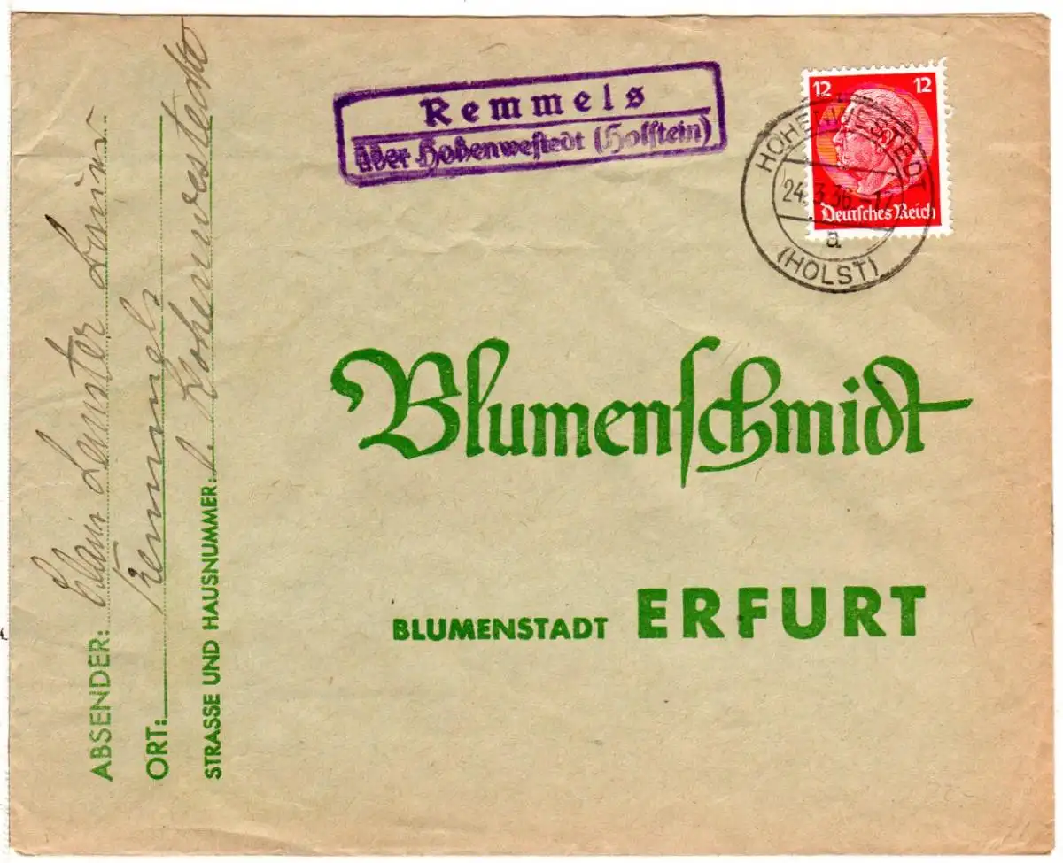 DR 1936, Landpost Stpl. REMMELS über Hohenwestedt (Holstein) auf Brief m. 12 Pf