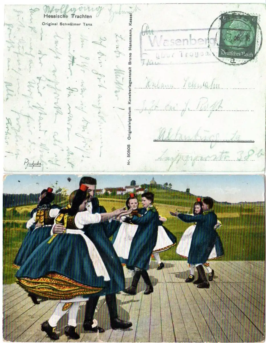 DR 1936, Landpoststpl. WASENBERG über Treysa auf Farb-AK m. 6 Pf.
