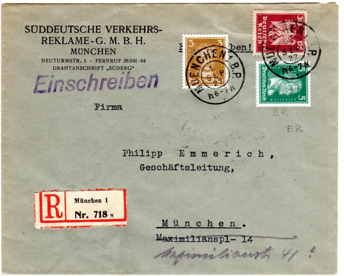 DR 1937, 3+5+30 Pf. je m. perfin auf Orts-Einschreiben Firmenbrief v. München