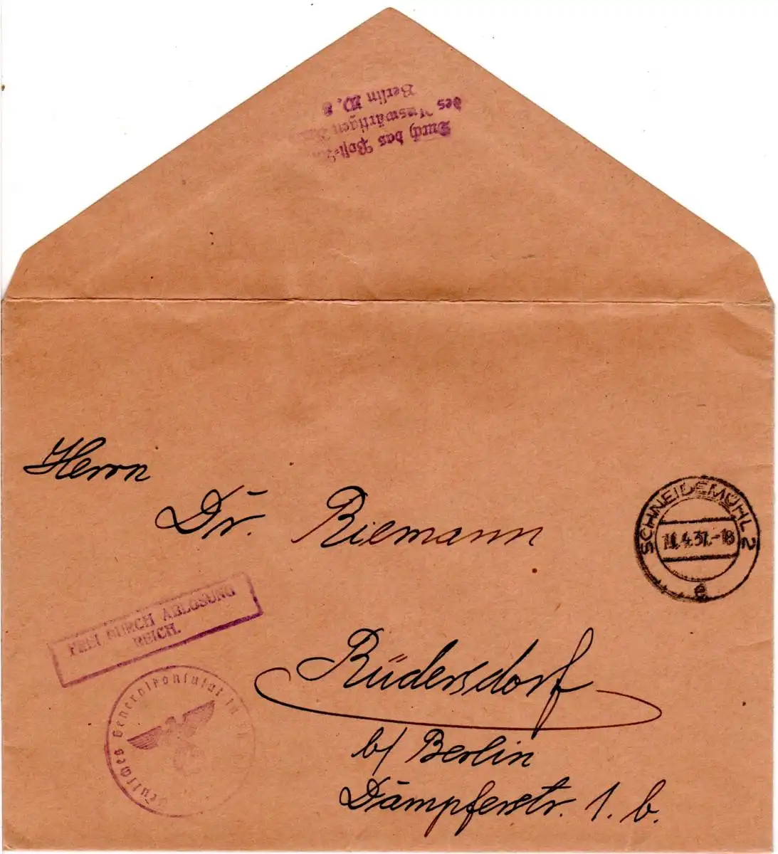 Rückseitig L3 Durch das Post-Amt des Auswärtigen Amtes Berlin W.8 u. vorders. Frei Durch Ablösung Reich zus. m. Briefstpl. Deutsches Generalkonsulat in Thorn auf Umschlag v. Schneidemühl n. Rüdersdorf b. Berlin.