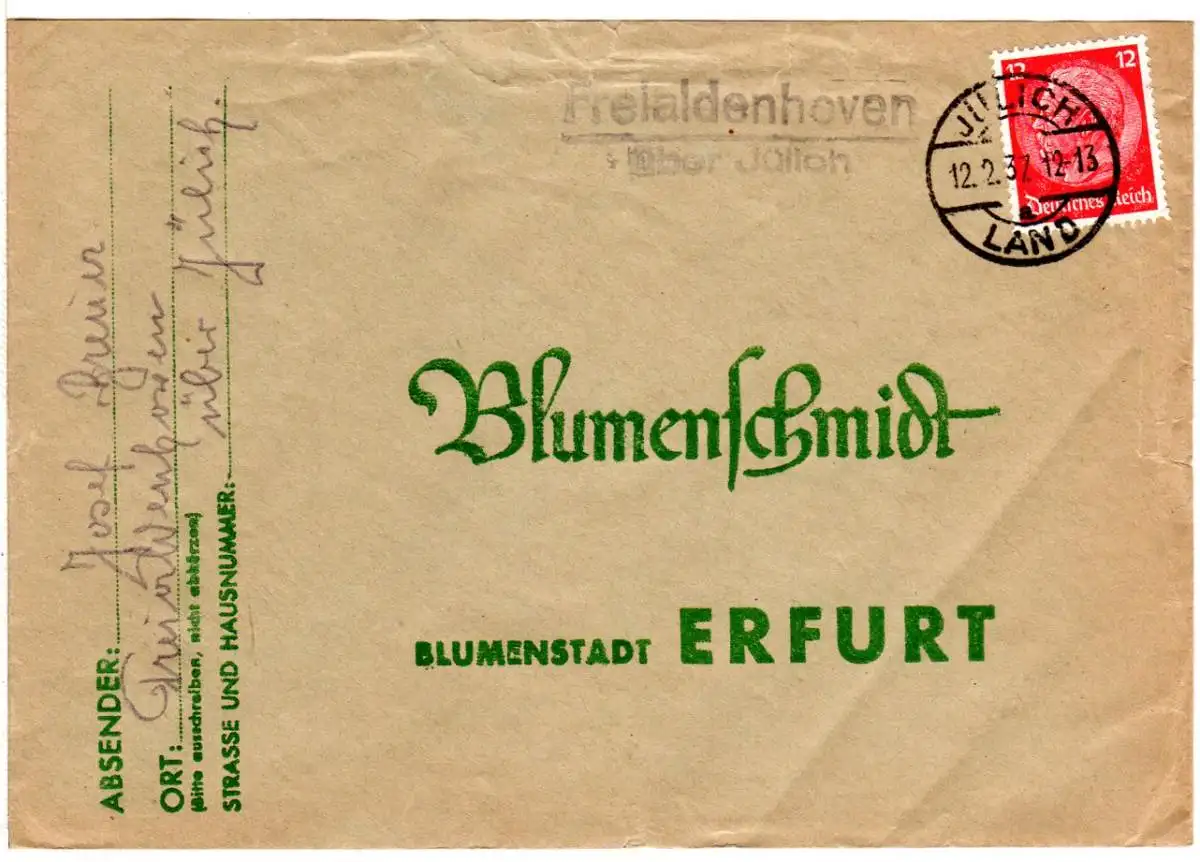 DR 1937, Landpost Stpl. FREIALDENHOVEN über Jülich auf Brief m. 12 Pf.