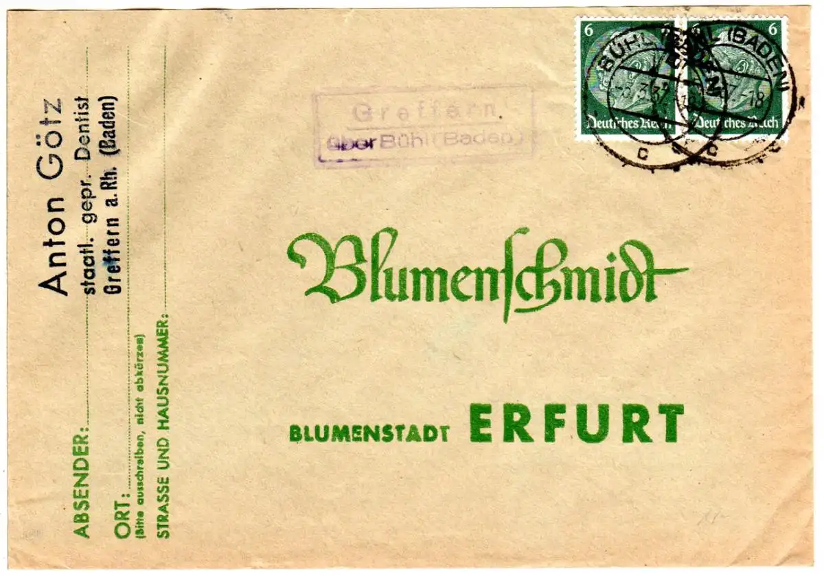 DR 1937, Landpost Stpl. GREFFERN über Bühl auf Brief m. 2x6 Pf.