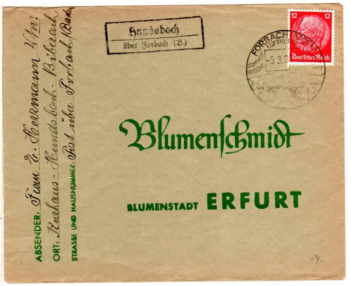 DR 1937, Landpost Stpl. HUNDSBACH über Forbach (B.) auf Brief m. 12 Pf.