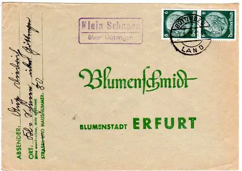 DR 1937, Landpost Stpl. KLEIN SCHNEEN über Göttingen auf Brief m. 2x6 Pf.