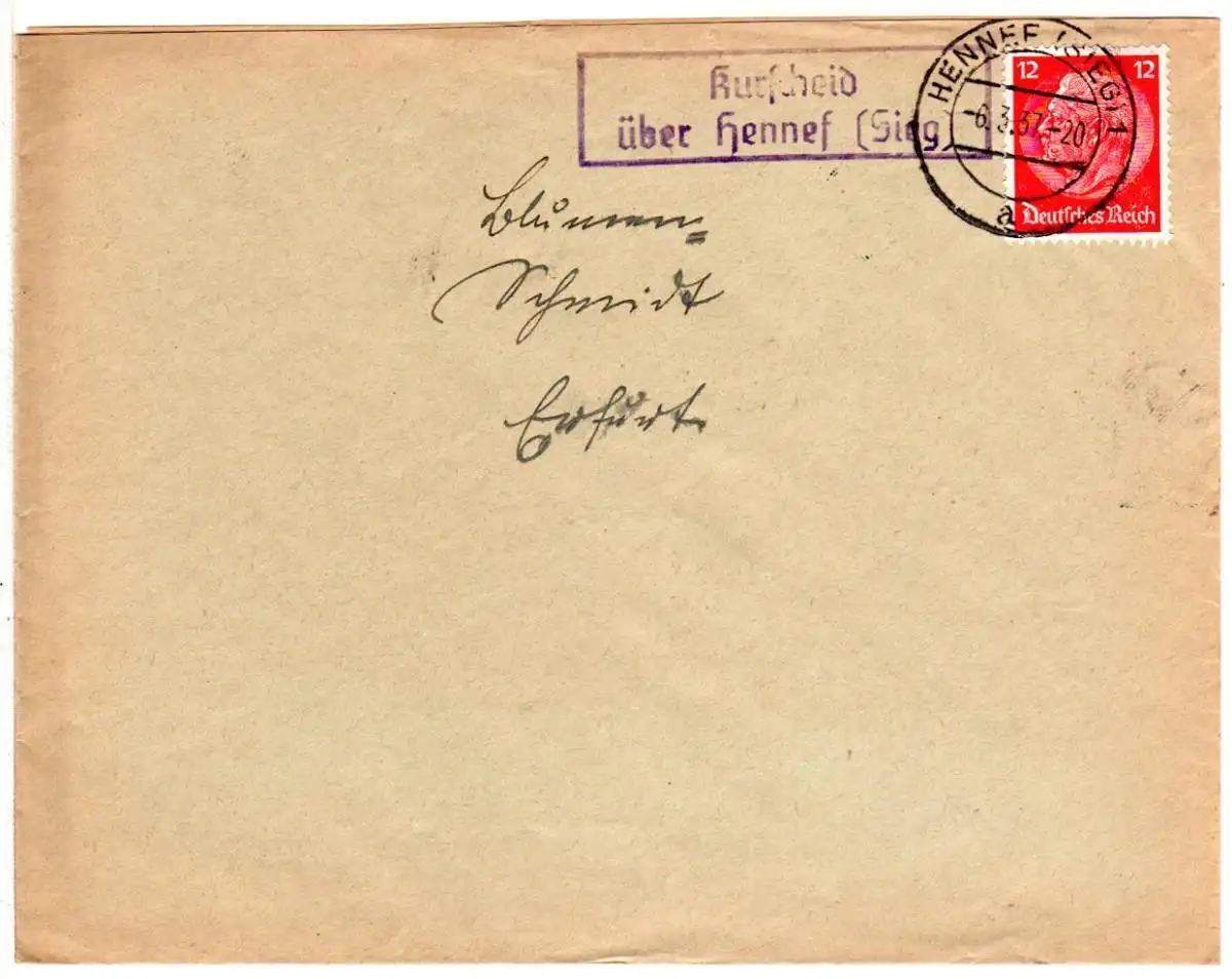 DR 1937, Landpost Stpl. KURSCHEID über Hennef (Sieg) auf Brief m. 12 Pf.