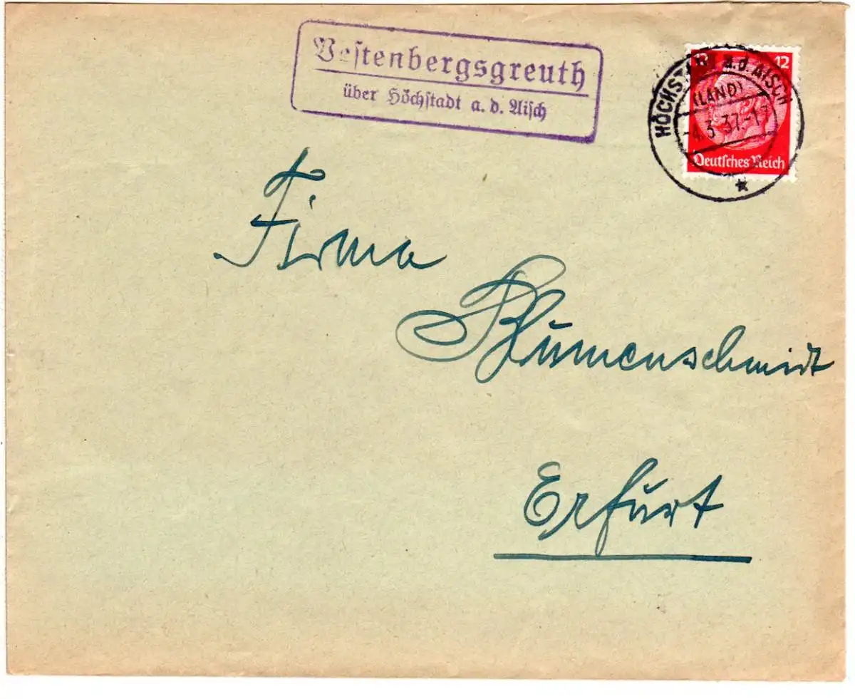 DR 1937, Landpost Stpl. VESTENBERGSGREUTH über Höchstadt auf Brief m. 12 Pf.