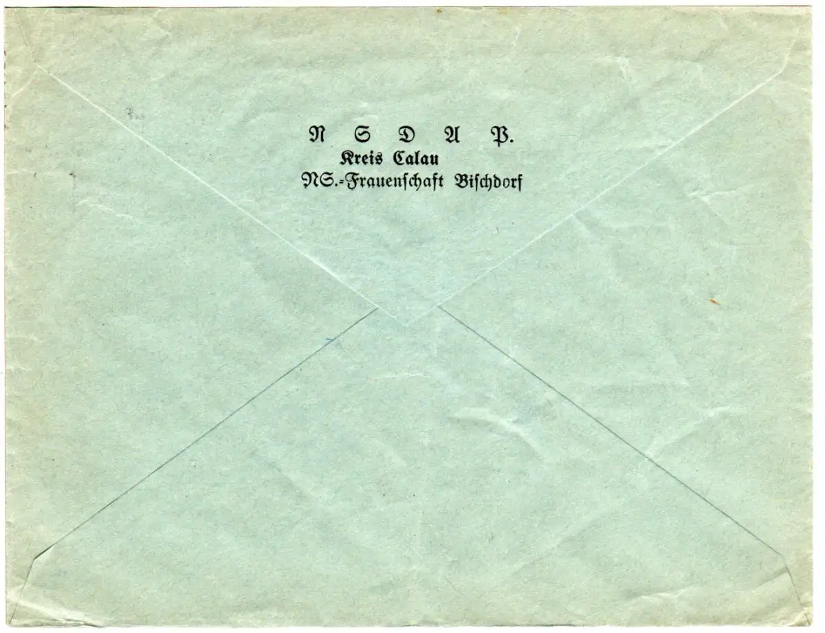 Landpoststellen II-Stempel auf Umschlag m. Absendervordruck NSDAP. Kreis Calau NS.-Frauenschaft Bischdorf. Bischdorf, niedersorbisch Wótšowc, ist ein Ortsteil der Stadt Lübbenau/Spreewald.